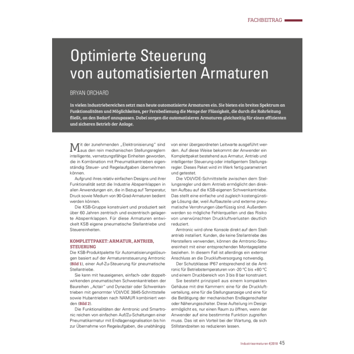| Beschreibung | In vielen Industriebereichen setzt man heute automatisierte Armaturen ein. Sie bieten ein breites Spektrum an Funktionalitäten und Möglichkeiten, per Fernbedienung die Menge der Flüssigkeit, die durch die Rohrleitung fließt, an den Bedarf anzupassen. Dabei sorgen die automatisieren Armaturen gleichzeitig für einen effizienten und sicheren Betrieb der Anlage. |