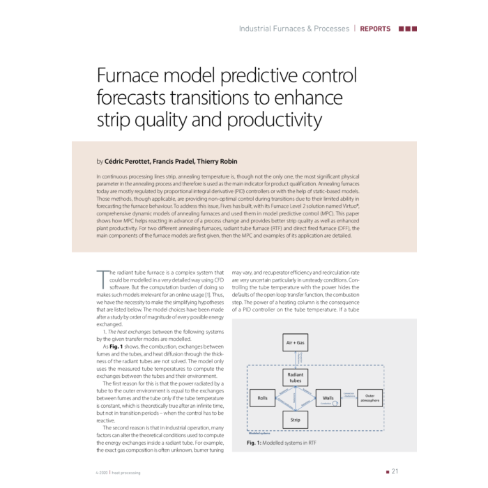 In continuous processing lines strip, annealing temperature is, though not the only one, the most significant physical parameter in the annealing process and therefore is used as the main indicator for product qualification. Annealing furnaces today are mostly regulated by proportional integral derivative (PID) controllers or with the help of static-based models. Those methods, though applicable, are providing non-optimal control during transitions due to their limited ability in forecasting the furnace behaviour. To address this issue, Fives has built, with its Furnace Level 2 solution named Virtuo®, comprehensive dynamic models of annealing furnaces and used them in model predictive control (MPC). This paper shows how MPC helps reacting in advance of a process change and provides better strip quality as well as enhanced plant productivity. For two different annealing furnaces, radiant tube furnace (RTF) and direct fired furnace (DFF), the main components of the furnace models are first given, then the MPC and examples of its application are detailed.