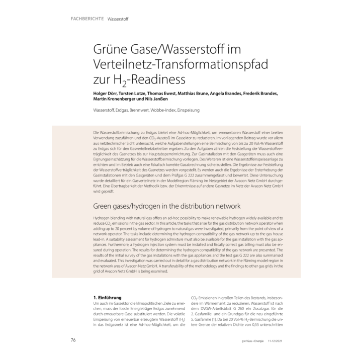 Die Wasserstoffbeimischung zu Erdgas bietet eine Ad-hoc-Möglichkeit, um erneuerbaren Wasserstoff einer breiten Verwendung zuzuführen und den CO2-Ausstoß im Gassektor zu reduzieren. Im vorliegenden Beitrag wurde vor allem aus netztechnischer Sicht untersucht, welche Aufgabenstellungen eine Beimischung von bis zu 20 Vol.-% Wasserstoff zu Erdgas sich für den Gasverteilnetzbetreiber ergeben. Zu den Aufgaben zählen die Feststellung der Wasserstoffverträglichkeit des Gasnetzes bis zur Hauptabsperreinrichtung. Zur Gasinstallation mit den Gasgeräten muss auch eine Eignungseinschätzung für die Wasserstoffbeimischung vorliegen. Des Weiteren ist eine Wasserstoffeinspeiseanlage zu errichten und im Betrieb auch eine fiskalisch korrekte Gasabrechnung sicherzustellen. Die Ergebnisse zur Feststellung der Wasserstoffverträglichkeit des Gasnetzes werden vorgestellt. Es werden auch die Ergebnisse der Ersterhebung der Gasinstallationen mit den Gasgeräten und dem Prüfgas G 222 zusammengefasst und bewertet. Diese Untersuchung wurde detailliert für ein Gasverteilnetz in der Modellregion Fläming im Netzgebiet der Avacon Netz GmbH durchgeführt. Eine Übertragbarkeit der Methodik bzw. der Erkenntnisse auf andere Gasnetze im Netz der Avacon Netz GmbH wird geprüft.