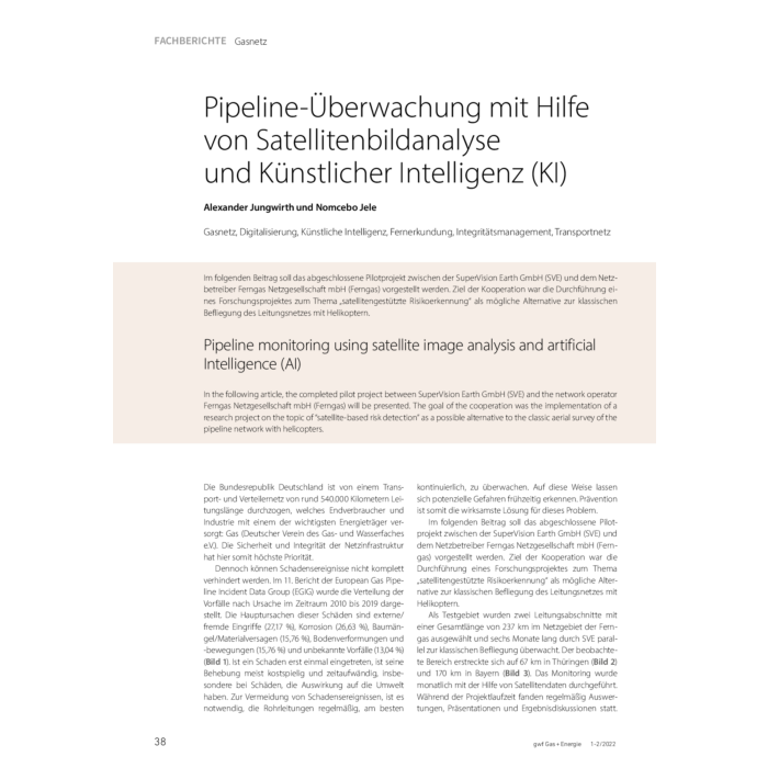 Im folgenden Beitrag soll das abgeschlossene Pilotprojekt zwischen der SuperVision Earth GmbH (SVE) und dem Netzbetreiber Ferngas Netzgesellschaft mbH (Ferngas) vorgestellt werden. Ziel der Kooperation war die Durchführung eines Forschungsprojektes zum Thema „satellitengestützte Risikoerkennung“ als mögliche Alternative zur klassischen Befliegung des Leitungsnetzes mit Helikoptern.
