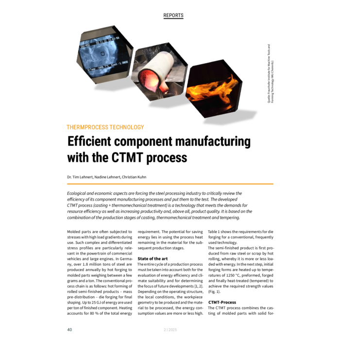 Ecological and economic aspects are forcing the steel processing industry to critically review the efficiency of its component manufacturing processes and put them to the test. The developed CTMT process (casting + thermomechanical treatment) is a technology that meets the demands for resource efficiency as well as increasing productivity and, above all, product quality. It is based on the combination of the production stages of casting, thermomechanical treatment and tempering.