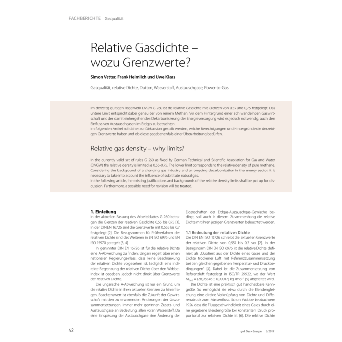 | Beschreibung | Im derzeitig gültigen Regelwerk DVGW G 260 ist die relative Gasdichte mit Grenzen von 0,55 und 0,75 festgelegt. Das untere Limit entspricht dabei genau der von reinem Methan. Vor dem Hintergrund einer sich wandelnden Gaswirtschaft und der damit einhergehenden Dekarbonisierung der Energieversorgung wird es jedoch notwendig, auch den Einfluss von Austauschgasen im Erdgas zu betrachten., Im folgenden Artikel soll daher zur Diskussion gestellt werden, welche Berechtigungen und Hintergründe die derzeitigen Grenzwerte haben und ob diese gegebenenfalls einer Überarbeitung bedürfen., |